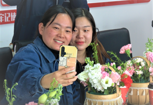 (图为女职工与插花作品合影留念)