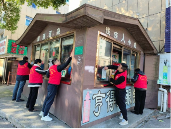 图为“香溢”志愿者为残疾零售户打扫店铺卫生