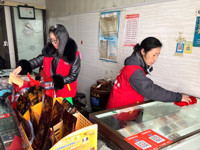 图为志愿者帮助零售户整理柜台。张小芳/摄