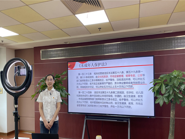 “新修订的《未成年人保护法》已经开始施行,里面有一些法条和我们零售户的日常经营息息相关,必须引起注意,比如这次修订新增了禁止向未成年人销售烟的条款……”“云上普法直播间”内,李颖正通过案例分析、法条讲解等形式为辖区零售户宣贯新修订的《未成年人保护法》。