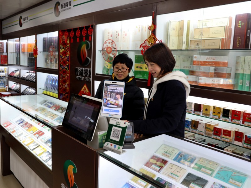 图为任思思与零售户沟通卷烟销售情况。林可歆/摄