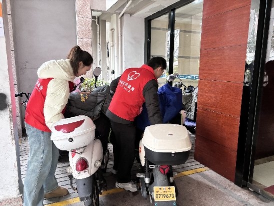 图为“香溢”志愿者协助当地社区开展电瓶车违规停放整治活动。章丹妮摄