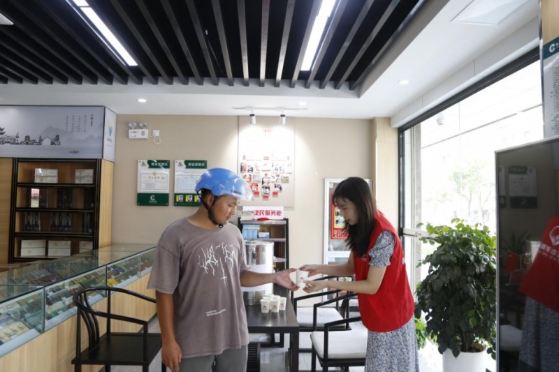 “我刚在附近送完单,看到有红色驿站的指示牌,就想来这儿休息一下。”外卖小哥接过“香溢”志愿者递出的凉茶说。