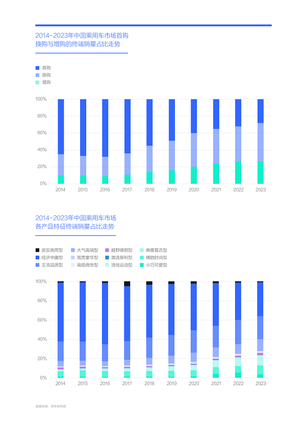 之所以造型平平的车型在过去二十多年的中国车市纷纷爆款,是因为多数中国购车用户属于首购,且以结婚购车等刚需为主,对造型诉求并不强烈。近六七年,随着首购用户的突然大幅减少,和2019年起中国车市全面进入存量时代,推动了小巧可爱、精致时尚、流线运动、越野硬朗等个性化车市的蓬勃发展,个性产品的销量占比由2018年12%快速升至2023年26%,经济中庸型产品的份额快速缩至35%,朗逸、轩逸、哈弗H6等绝大多数造型平平的产品,市场表现也越来越平平;