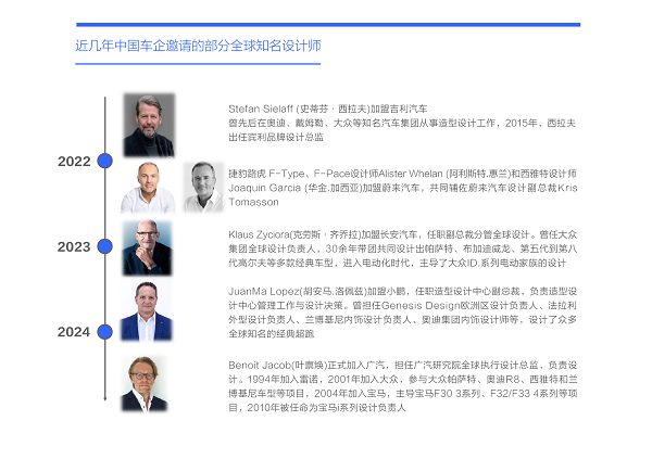 面对中国用户的突然“变心”,更多的在华车企并没有自暴自弃或借酒消愁,而是主动应对,积极招聘全球知名设计师:2022年前宾利设计总监Stefan Sielaff 受邀加盟吉利汽车,同年前捷豹路虎设计师Alister Whelan、前西雅图设计师Joaquin Garcia等受邀加盟蔚来汽车;2023年前大众集团全球设计负责人Klaus Zyciora受邀加盟长安汽车;2024年前宝马设计师Benoit Jacob受邀加盟广汽……车企在积极引进全球知名设计师之际,也在努力培育中国本土优秀设计人才,已涌现出广汽的张帆、上汽的邵景峰、哪吒的常冰等部分具有代表性的本土设计人才;