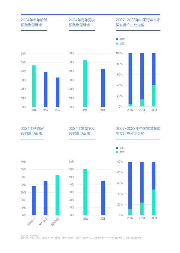 2024年青年、富豪也有高造型诉求,且主力的女青年、女富豪仍是女性,再次敦促车企将本轮新造型的“白衣骑士”锁定女性