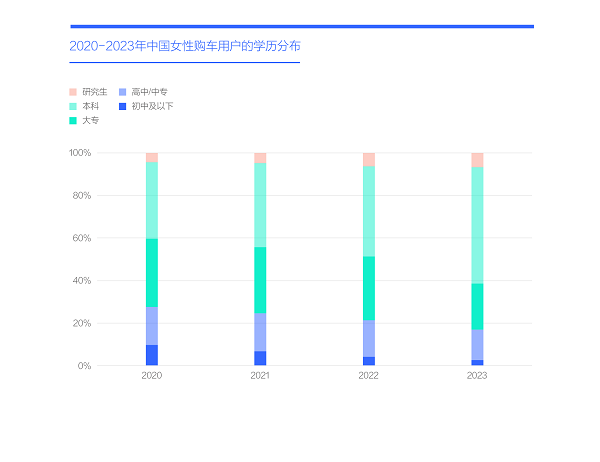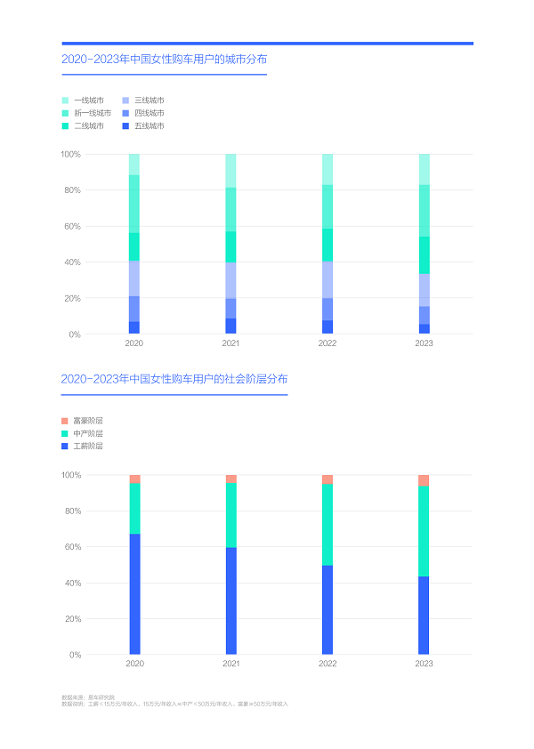 天生爱美,更喜欢追求时尚、潮流,一定是女性购车用户有较高造型诉求的关键因素。除此之外,也有不少其它因素:中国女性购车用户的学历越来越高,2020-2023年,女性车市的大专及以上的高学历占比持续提升,并突破80%,理论上,学历越高,审美越高,对造型的诉求自然也越高;中国女性购车用户高度集中一线、新一线和二线之大城市,2020-2022年的大城占比维持在60%的高位,疫情之后的2023年快速突破66%,理论上,大城女性的审美更高,对造型诉求自然更高;中国女性购车用户的家庭收入水平以中产和富豪为主,2020-2023年,两者占比快速逼近60%,理论上,家庭收入越高,越可能为差异化的造型买单……未来几年,基本预判女性购车用户的高学历占比、集中大城、中产和富豪占比高等特征还会持续存在,甚至更显著。诸如之前买车是女孩子们出嫁的标配,现在买车是女孩子大学毕业后参加工作的标配,未来只会更盛行;