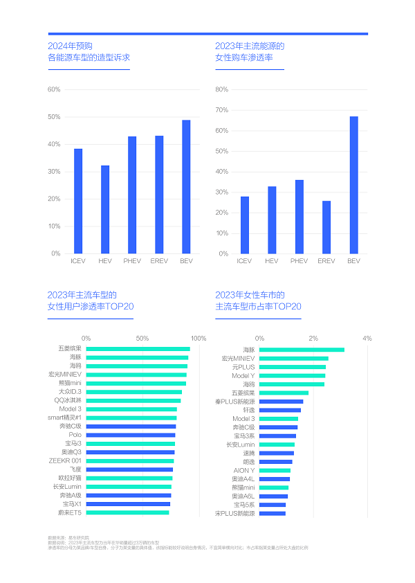 调研发现女性用户与电动车具有强相关性:2023年女性为中国纯电车市贡献了近67%的市场销量;2023年无论是女性车市的车型渗透率TOP20,还是车型市占率TOP20,纯电产品都占据主体,且垄断了前列位置……电动车与造型也有强相关性,2024年电动车的造型诉求接近49%,清一色高于插混、增程、燃油等其它能源产品的造型诉求;
