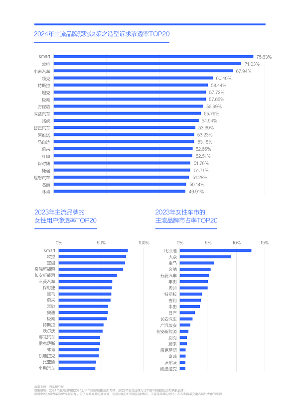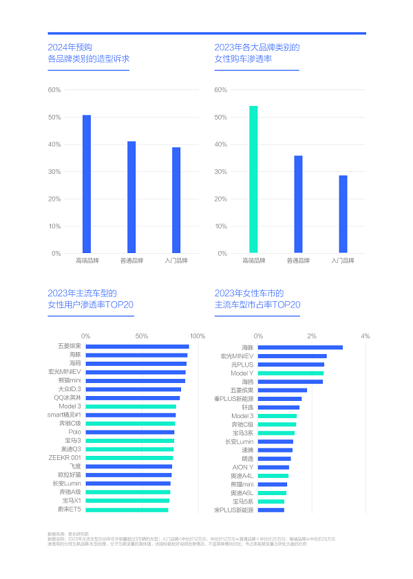 2024年造型诉求突出的smart、欧拉、保时捷、蔚来、极氪、特斯拉等电动车品牌或高端品牌,部分也在2023年主流品牌女性渗透率与市占率的TOP20,说明女性、造型、电气化与高端化之间存在强相关性,车企如能有效组合,没准就可以演奏出优美的新旋律;
