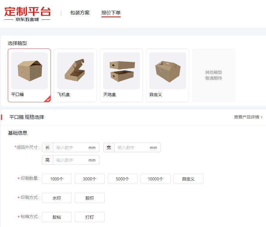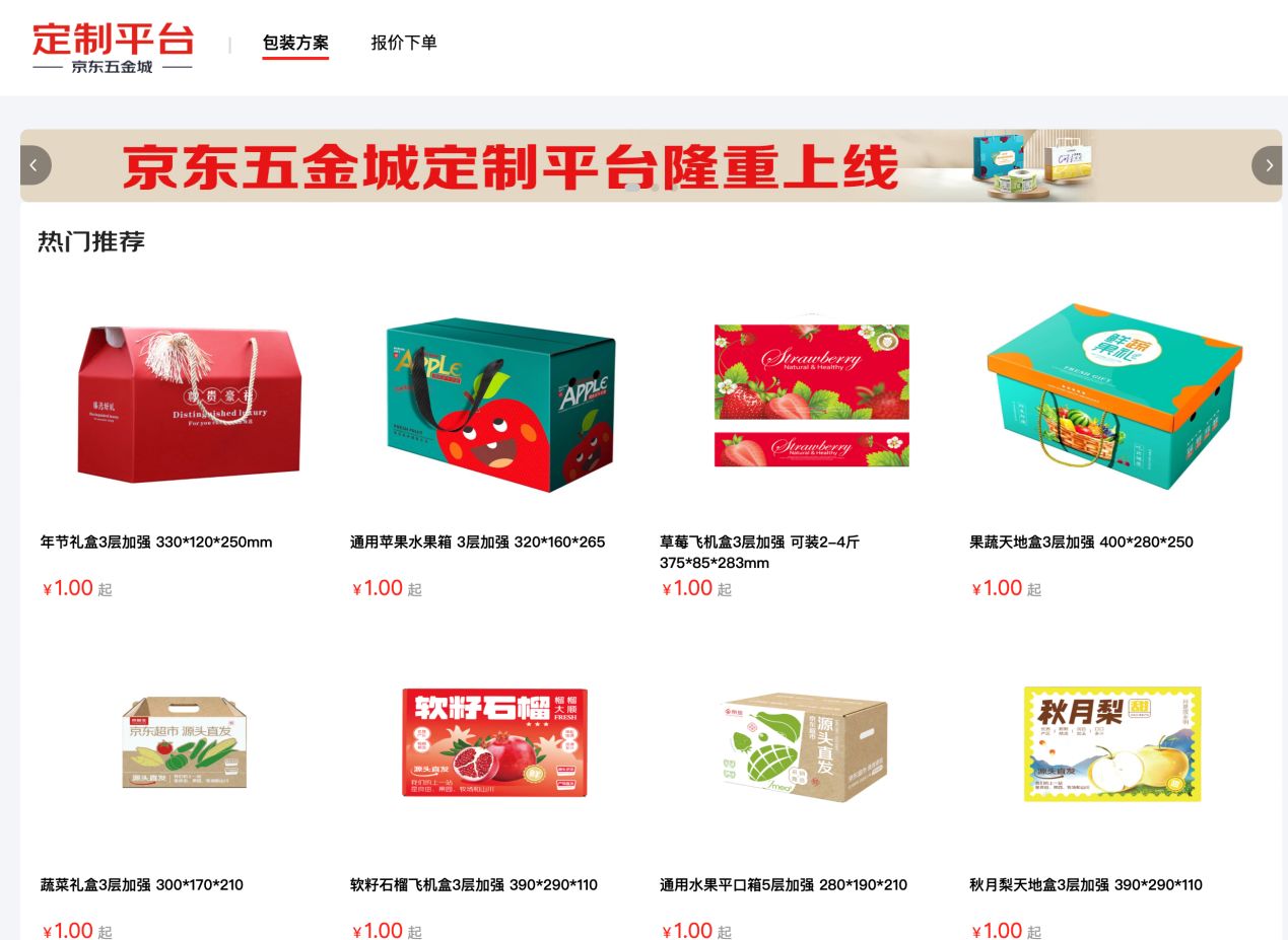 用户登录京东五金城定制平台后,只需选择基础箱型并填写外观尺寸、印刷数量、印刷方式、配材方案、纸张材质、粘箱方式等基础信息并上传印刷文件,即可自动生成报价。而对于不熟悉包装设计的用户,京东五金城定制平台还提供了现成的包装方案,供用户直接套用。当前,平台已针对热门农产品上线了苹果水果箱、草莓飞机盒、软籽石榴飞机盒、果蔬天地盒、秋月梨天地盒等共计8种包装方案,不仅能够显著降低定制的门槛,还可有效保护农产品在运输过程中的完整性和新鲜度,减少损耗和浪费,尤其适合广大农户。