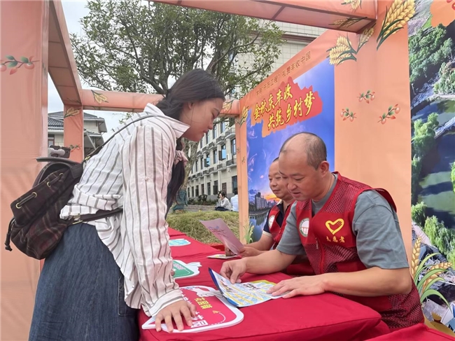 (图为:志愿者们为丰收节布置会场,搭建展台)