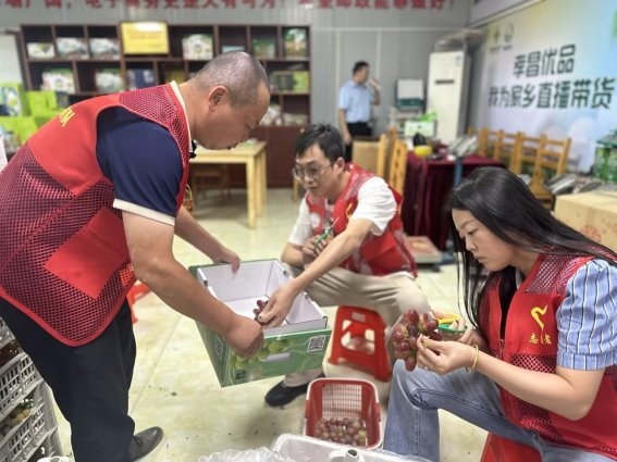 (图为:志愿者们帮忙园区挑选葡萄打包装箱)