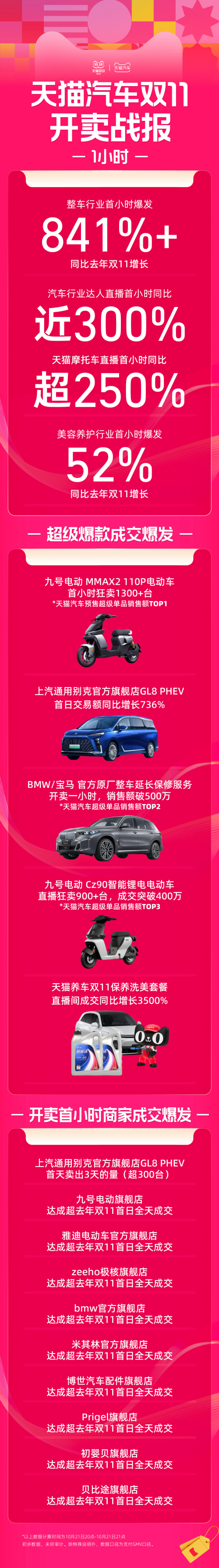 在新体系的引领下,诸多汽车行业品牌商家迎来了销量爆发:九号电动旗舰店、雅迪电动车官方旗舰店、zeeho极核旗舰店等二轮车行业商家以及bmw官方旗舰店、米其林官方旗舰店、博世汽车配件旗舰店等车后行业商家均在双11现货开卖1小时达成去年开卖首日全天成交;天猫养车双11保养洗美套餐直播间成交同比增长3500%!