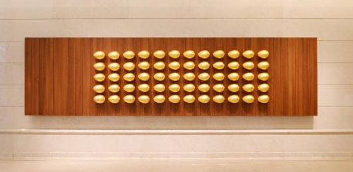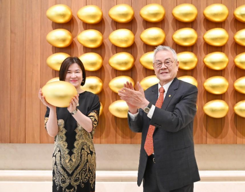 震旦集团创办人陈永泰将第60颗“金蛋”传递给董事长袁蕙华挂上金蛋墙