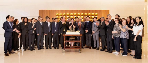 吉时一到,震旦集团创办人陈永泰将金蛋传递给董事长袁蕙华,由董事长袁蕙华在同仁们的殷切注视下庄重悬挂第60颗金蛋,象征着震旦正式迈入第60年。