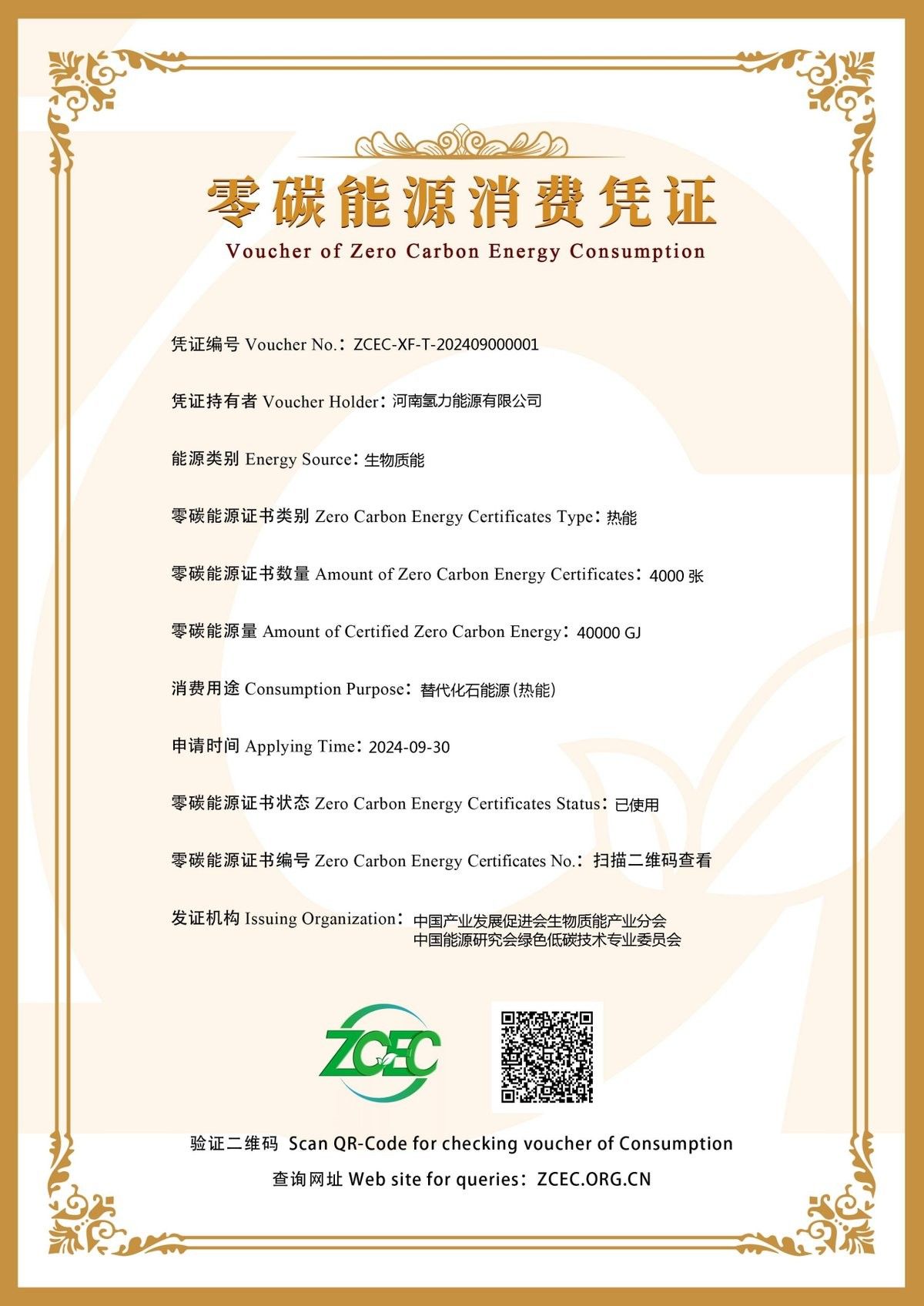 在国内首张零碳能源消费凭证颁发仪式上,郑朝晖副会长为河南氢力能源有限公司颁发了零碳能源消费凭证,完成了“零碳能源证书自愿核证平台”从证书申请、监测、核查、核发、认购、交易和消费全流程的闭环。