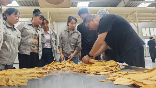 (李云教徒弟和分选工人们学习烟叶分级 马梓铭/摄)