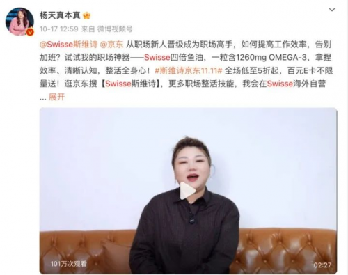 为了深入职场年轻人的精神阵地,构建高度的圈层认同。17日, Swisse斯维诗诚挚邀请金牌经纪人、职场高能量女性——杨天真,化身“Swisse首席加油官”,结合职场问题,通过微博视频为粉丝答疑解惑,呼吁职场群体注意健康防患,适当补充营养,做有元气、有发量、有脑力、有眼力的“四有职场人”。