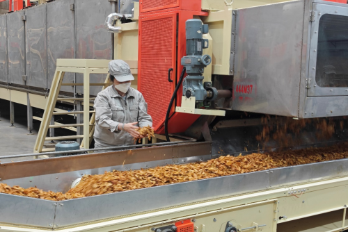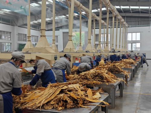 走进现代化的打叶车间,机器轰鸣,却又不失秩序井然,烟叶在这里经过铺叶摆把、一润、二润、随后进入打叶风分机进行叶梗分离,叶片与烟梗分离,有利于后续加工中香料和添加剂的均匀吸附;而烟梗则可用于提取烟碱或其他副产品,实现资源的最大化利用。经历打叶风分后的烟叶将进入复烤环节,复烤环节是对烟叶进行热处理的关键步骤。在特定温度与湿度控制下,烟叶中的水分被适度蒸发,同时烟叶内部的化学成分发生微妙变化,使烟叶更加柔软,香气更加浓郁,并达到稳定的储存状态。