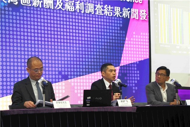 图片1 & 2: (左起)香港人才管理协会副会长兼2024粤港澳大湾区薪酬及福利调查委员会主席梁伟佳先生、浸大人力资源策略及发展研究中心主任黄旭教授及副主任叶伟光博士公布“2024粤港澳大湾区薪酬及福利调查”结果。