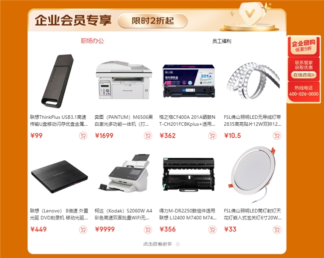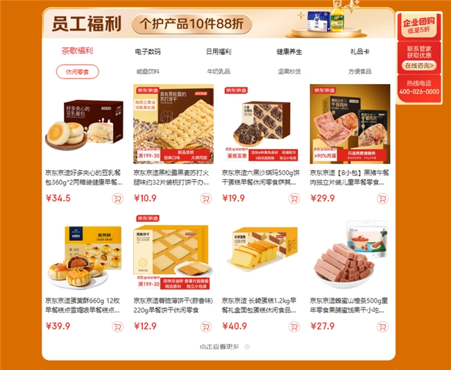 随着企业经营管理的精细化发展以及人才对于企业创新发展的价值凸显,企业对市场营销及员工福利物资的个性化、场景化需求越发强烈。在员工福利专区,京东企业购集结了包括茶歇福利、电子数码、日用福利、健康养生等多品类实物商品以及京东E卡等虚拟商品,大大增加了企业的福利选择空间与自由度。