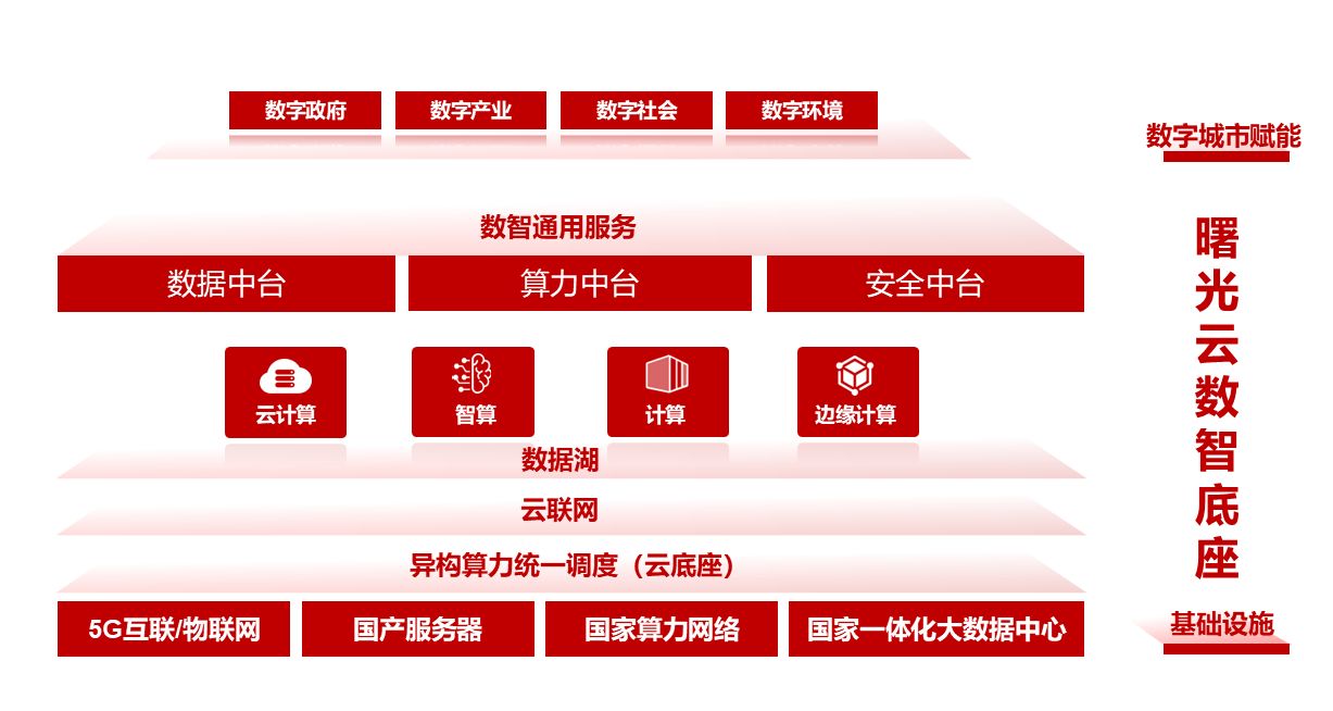 曙光云着眼于新型智慧城市全链路数据管理要求,打造全栈云Stack平台,以算力、数据、安全“三位一体”能力,为新型智慧城市发展构建数智云底座。