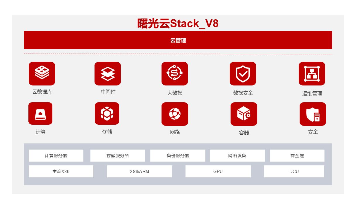 算力底座是城市数据的物理载体和连接基础,支撑数据顺畅流通。针对城市全域数字化转型的应用场景,曙光全栈云Stack底座将支撑这些应用的通用存储资源、计算资源、网络资源、AI计算资源、数据库组件、容器CCE、大数据基础组件EMR、中间件、技术引擎等进行了统一集成和优化,通过打造基础性的云原生底层能力支撑平台,提供开放兼容的公共赋能组件。