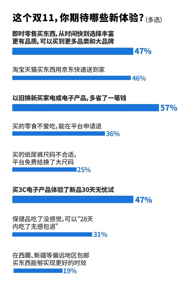 在双十一新服务新体验方面,有57%的人选择省心省钱的一站式以旧换新服务,47%的人期待配送快、选择丰富、更有品质的即时零售服务,还有47%期待体验3C电子产品新品30天无忧试用。此外,零食“不爱吃就退款”、保健品“28天内吃了无感包退”等更具突破性的服务体验也让消费者格外期待。