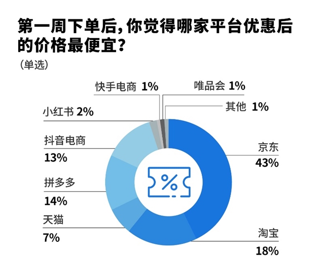 今天的消费者,正在以实际行动颠覆“买的没有卖的精”的商业定律,他们纷纷表示“可以买贵的,不能买贵了,最好能用我的精明给商家上一课”。调研结果显示,超五成消费者在确定心仪产品后会到各平台比价,选择更便宜的渠道购买。48%的消费者会提前加购所需商品,计算怎么凑单、用券最划算。综合第一周下单情况,43%的消费者认为京东优惠后的价格更便宜。