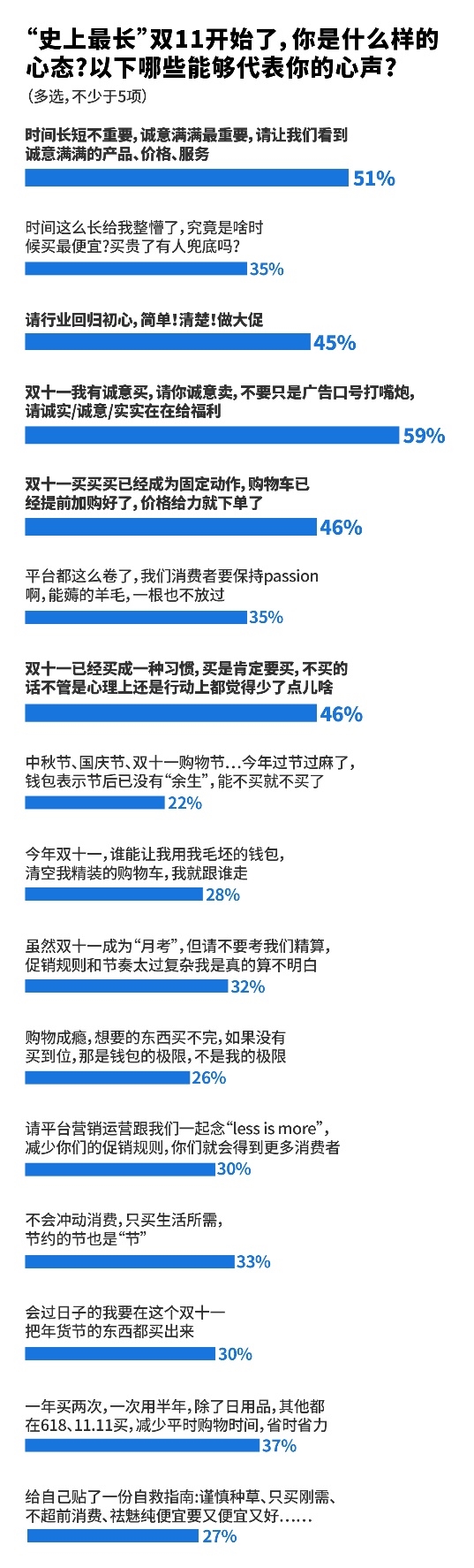 面对“史上最长”双十一,大部分消费者表示,一年两次大促已经成为购物的惯性动作,买还是要买的,只是有话要说:简单清楚做大促、诚意福利给足成为最强呼声。