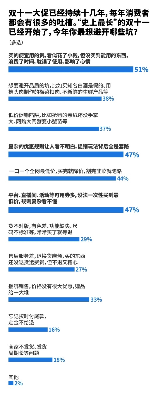 面对双十一可能踩的“坑”,超五成消费者最希望避开“买得便宜用得贵”这个“坑”,因为看似花了小钱,实则浪费时间耽误使用,最终影响心情。47%的消费者表示对那些规则复杂看不懂,没法一次性买到最低价的商家会“应避尽避”,敬而远之。相应地,给力的优惠和补贴力度、清晰明确的购物优惠规则成为消费者最希望看到的大促玩法。