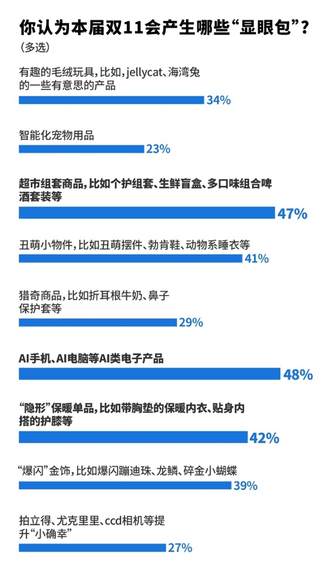 消费者还票选出了今年双十一的“显眼包”。48%的人青睐时下最新潮的AI手机、AI电脑等AI类电子产品;47%的人觉得把琐碎的日用品组套和组盲盒实在太有意思了,妥妥“显眼包”,个护组套省心、生鲜盲盒有趣、多口味啤酒套装省钱……;丑萌摆件、勃肯鞋、动物系睡衣等丑萌小物件自带走红潜质,也受到了41%消费者的追捧。
