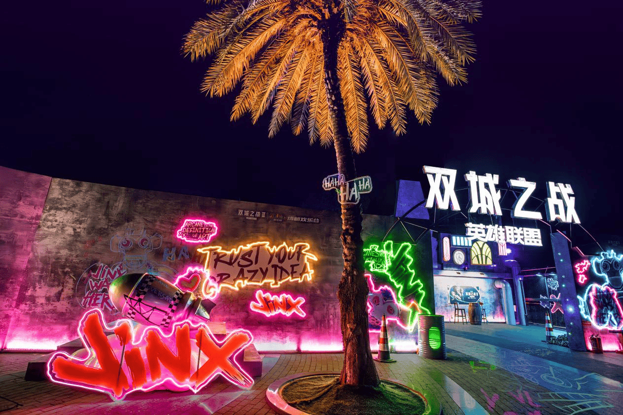在襄阳华侨城奇幻度假区,走进《英雄联盟:双城之战》主题街区,深入“皮城”和“祖安”,探索海克斯的秘密,与蔚、金克丝、凯特琳合影打卡,感受潮玩宇宙的魅力;上海欢乐谷将《英雄联盟:双城之战》打造为十大时空站之一,推出独家联名时光签,开启超多互动玩法;天津欢乐谷打造还原度超高街区;南京欢乐谷《英雄联盟:双城之战》废土大时代畅玩区尖叫亮相,谷迷可找到特定NPC,触发隐藏剧情;重庆欢乐谷推出“寻找金克丝”活动;深圳世界之窗定制与无人机表演结合的大型主题烟花……超多玩法,让游客在双城世界的场景中找到属于自己的乐趣和成就感。