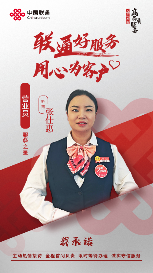 福泉联通营业员张仕惠于2022年10月加入联通大家庭,成为营业厅的一份子,自工作以来,始终秉持“客户至上,服务第一”的宗旨,积极踏实工作,时刻保持微笑服务,不断提升自己的业务能力及优质高效的服务。