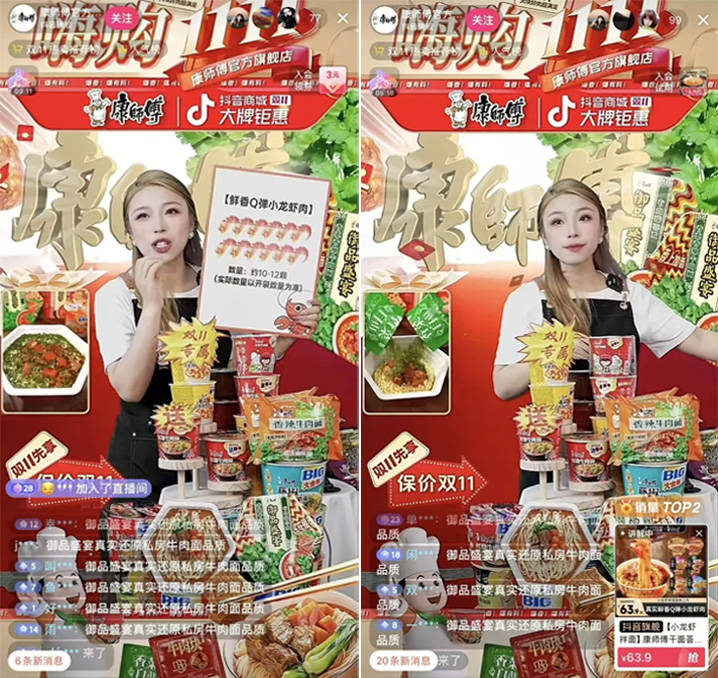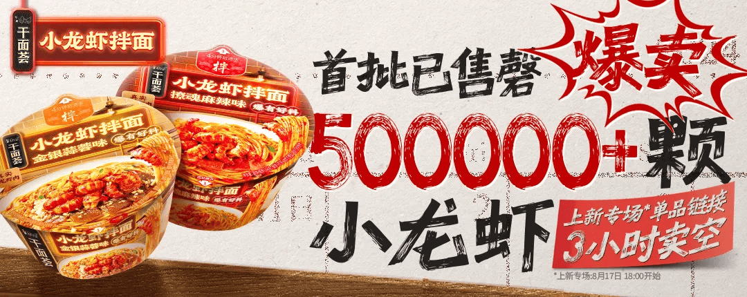 据Morketing的观察,自8月17日康师傅小龙虾拌面在抖音电商平台首发以来,就迅速掀起抢购热潮。消费者在抖音、小红书等社交平台上频频表示“美味好吃”“真材实料龙虾肉”,更是吐槽“销售太火爆”,甚至感叹“泡面都得蹲点直播间抢”。第二波上线后再次速速售罄,如今第三波上线,小龙虾拌面已稳居抖音官方旗舰店销量榜Top 2。