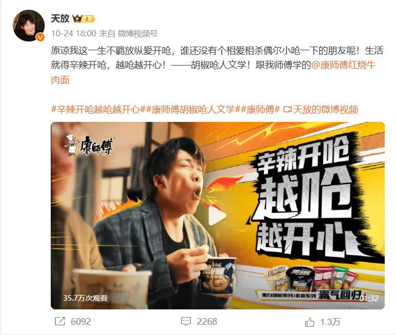 在创新之余,康师傅同样也重视经典产品的价值。近期,康师傅对黑胡椒牛排味面和白胡椒猪肚鸡面进行了升级回归。这两款经典产品通过配方升级和还原上市初期的包装设计,再次唤起了消费者的怀旧情感,也迎合了年轻消费者对复古潮流和独特风味的兴趣。为了更好地传递“霸气回归”的概念,康师傅特别邀请了喜人——天放拍摄“呛人” TVC,以幽默诙谐的方式诠释产品的个性和魅力。