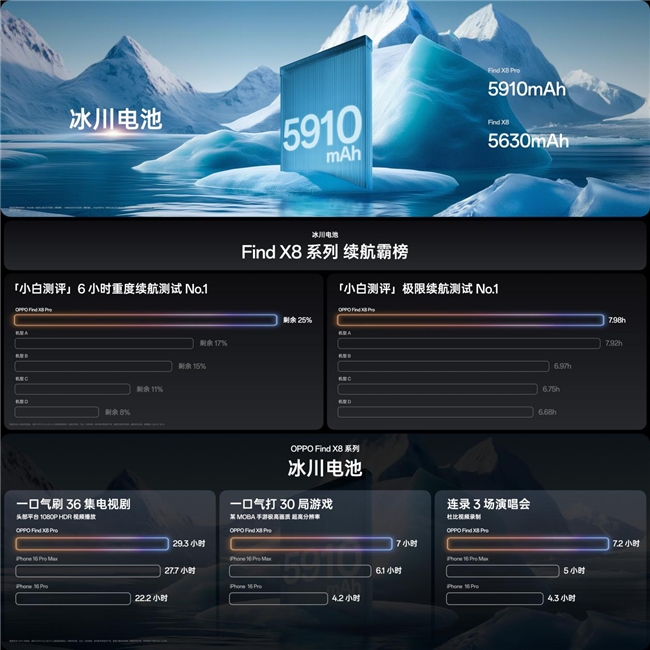 续航方面,OPPO Find X8系列的冰川电池也为其带来了出色的续航能力,Find X8配备5630mAh电池,Find X8 Pro则配备5910mAh电池,日常使用可以告别续航焦虑。并且Find X8系列还全面支持80W闪充以及50W无线闪充,可以快速补电。此次Find X8系列还带来全面升级的OPPO互传功能,而且还能与iPhone手机进行互传。