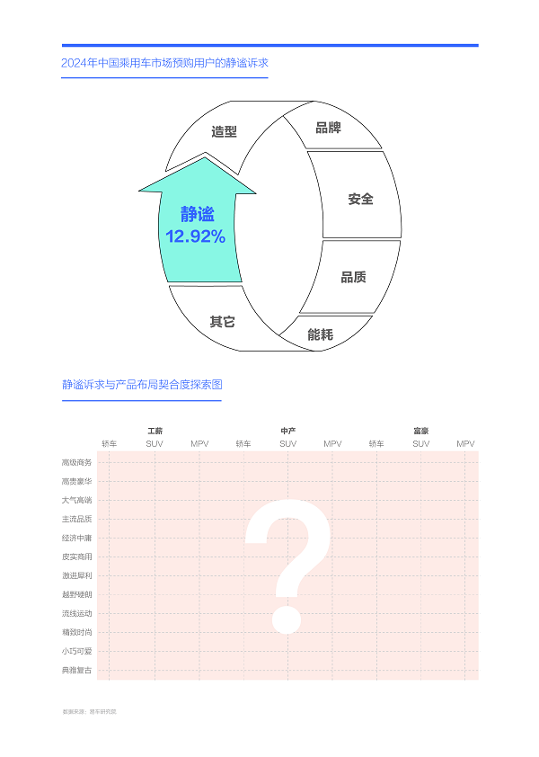 2024年中国购车用户的静谧诉求为12.92%,在整体排行中比较靠后,静谧性的价值可能更聚焦于某个细分车市