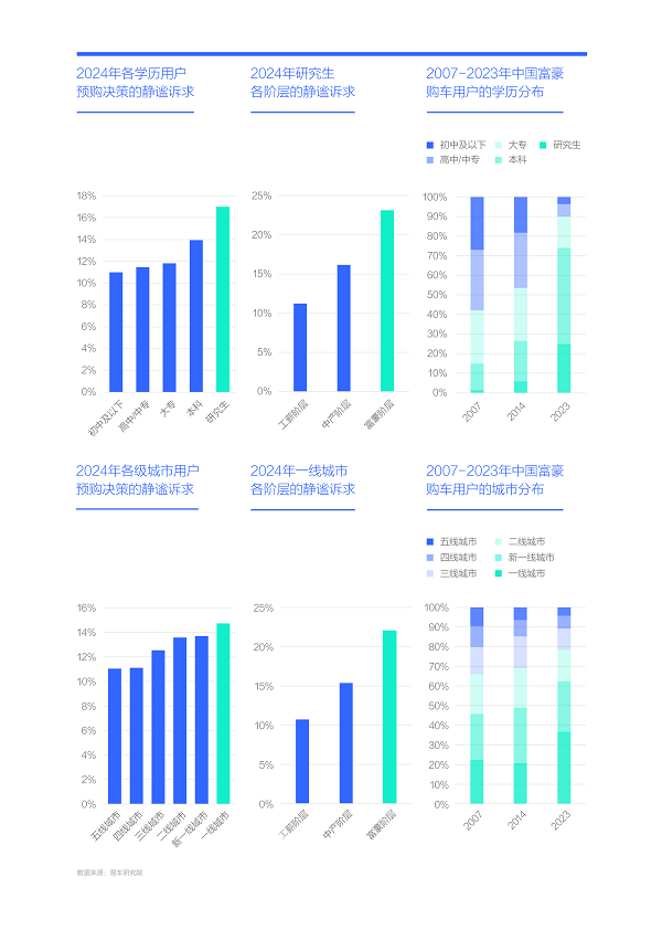越有钱的用户越想买辆安静点的车子,尤其是高学历富豪与大城富豪:2024年学历越高的用户,静谧诉求越高,其中研究生逼近17%。如把研究生群体按收入进一步划分,其中研究生富豪用户的静谧诉求更突出,2024年突破23%;2024年居住城市级别越大的用户,静谧诉求越高,其中北上广深之四大一线城市逼近15%。如把一线城市购车群体按收入进一步划分,其中一线城市富豪用户的静谧诉求更突出,2024年突破22%;