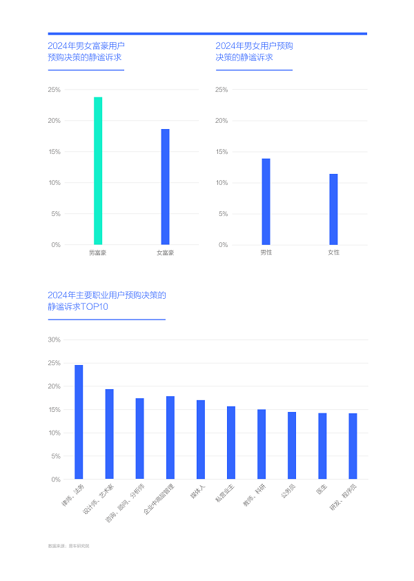 越有钱的用户越想买辆安静点的车子,尤其是男富豪。2024年男富豪的静谧诉求逼近24%,大幅领先于女富豪;