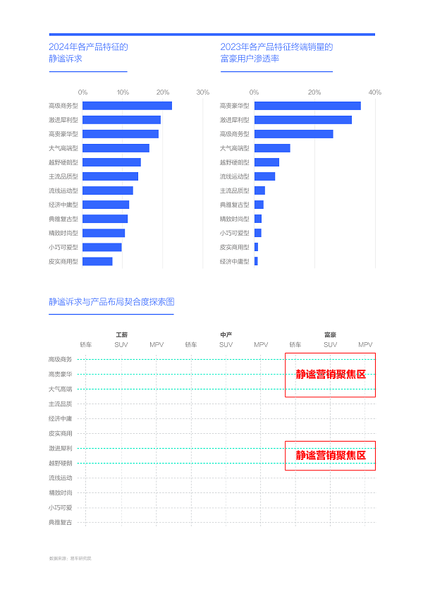 从产品特征看,2024年,位居静谧诉求TOP5的分别为高级商务型、激进犀利型、高贵豪华型、大气高端型与越野硬朗型,其中高级商务型以22.29%位居榜首,激进犀利型接近20%,高贵豪华型接近19%;从各大产品特征终端销量的富豪渗透率看,2023年位居TOP5的也是上述五大特征产品,只是前后排序有差异,高贵豪华型以35.18%位居榜首,即100位高贵豪华型产品的用户,就有超过35位属于富豪用户;
