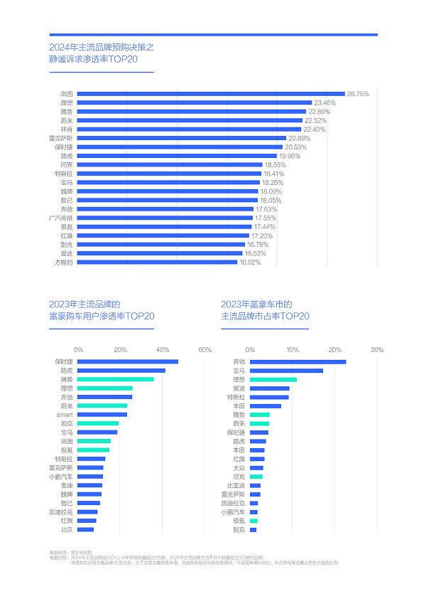 路虎、方程豹两大主打硬派风格的品牌也位列2024年静谧诉求TOP20,同样定位越野硬朗的坦克的静谧诉求接近TOP20,同时双双晋级2023年中国富豪车市主流品牌终端销量渗透率与市占率的TOP20,说明静谧也是个性品牌角逐富豪车市关键卖点。