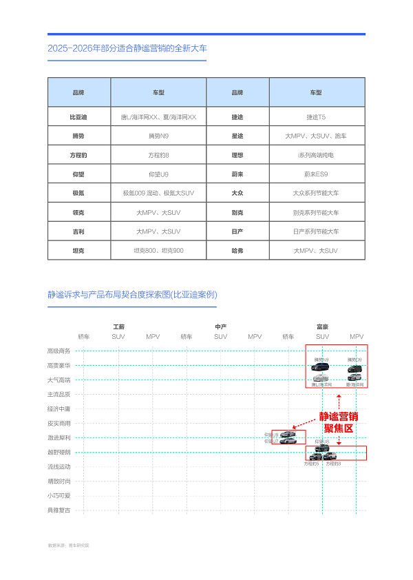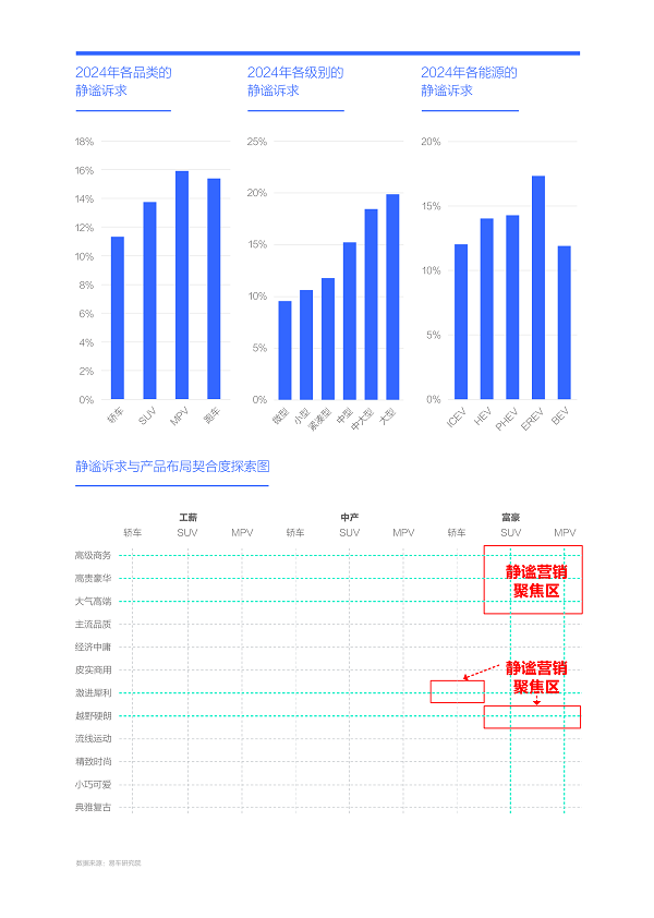 围绕富豪的静谧诉求,从品类、级别与能源切入,车企可重点挖掘大节能MPV与SUV的静谧卖点
