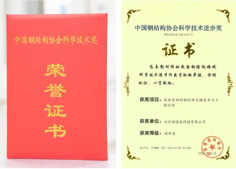 汉尔姆建筑科技有限公司与清华大学等共同完成的《高强度钢材钢结构关键技术与工程应用》荣获“2024年度中国钢结构协会科学技术进步奖特等奖”。