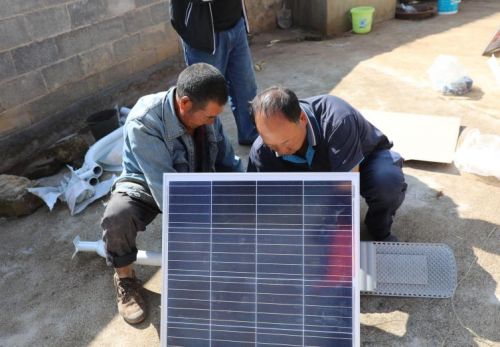 (厂内技术人员正在为村民安装太阳能路灯 朱吉美/摄)