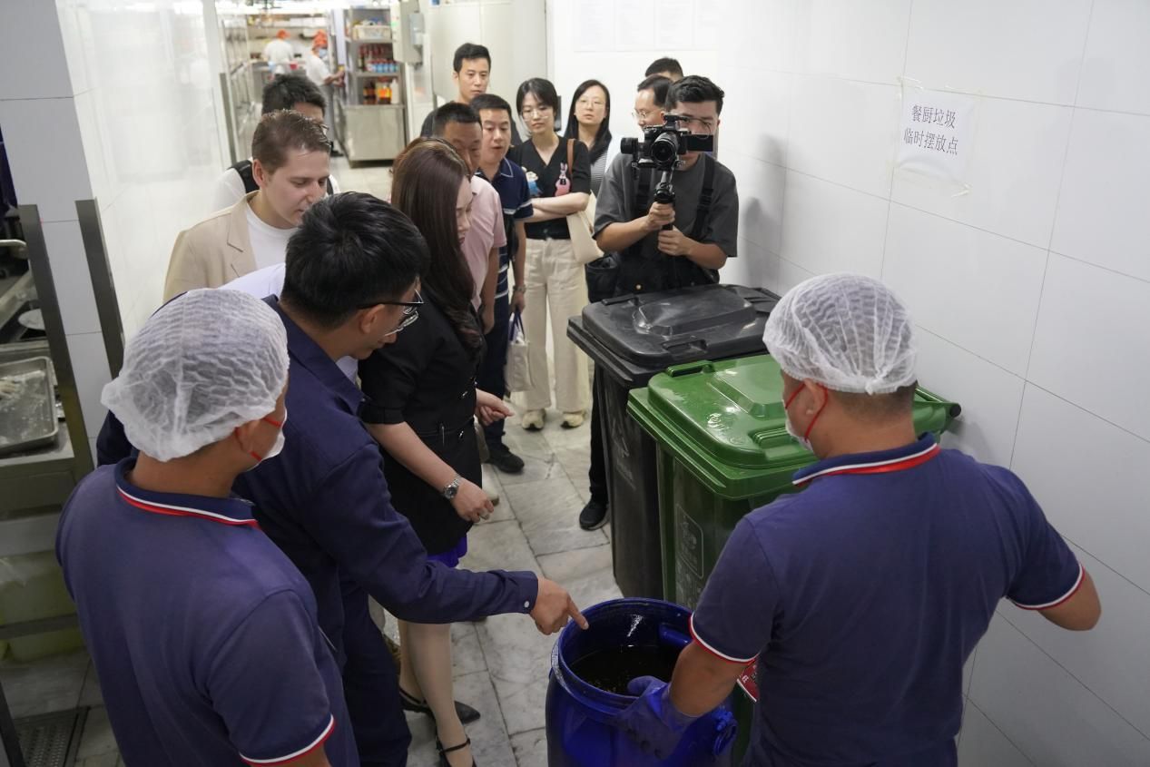 打卡探访团一行在餐厅后厨观看废弃食用油脂称重、收运过程 摄影 何岺南