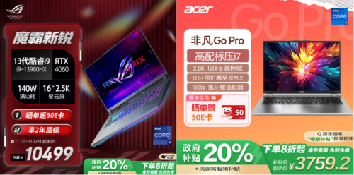 以ROG魔霸新锐2024款游戏本为例,原价10495元的140W满功耗、高性能游戏本产品,在京东领取政府补贴立减2000元,双11到手价只要8495元,相当于打了八折;宏碁非凡Go Pro 14英寸笔记本电脑也一样,原价4699元的大存储高刷全能本,领取政府补贴后到手价仅需3759.2元,晒单还赠送50E卡。