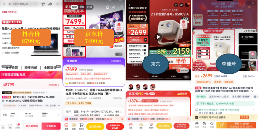 有网友曾晒出同款产品在不同平台的价格对比,不少产品在京东的价格确实要低于其他平台一些。比如七彩虹隐星P16笔记本电脑,京东价比抖音价便宜了1300元;坚果N1 Air高亮版投影仪,京东的券后价比李佳琦直播间便宜800多。