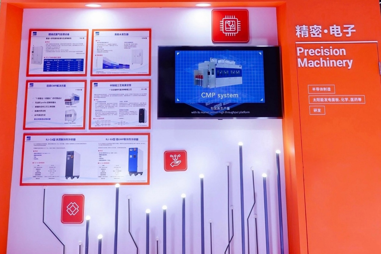 在精密·电子展区,荏原隆重推出了一系列尖端产品,包括最新的F-REX型CMP(化学机械抛光)设备、EV-X型中制程工艺用干式真空泵、TND型燃烧式废气处理设备、OZW型臭氧水发生器、以及半导体制造用冷却器等。