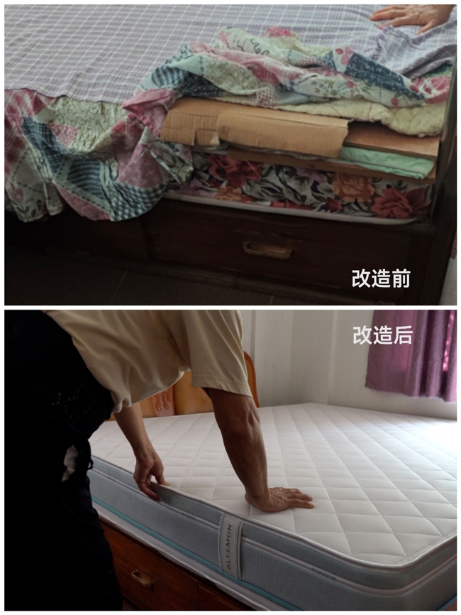 75岁高龄的刘志爽曾是一名退伍老兵,今年6月份被车撞伤后做了腰部手术,如厕时起身困难、洗澡时担心滑倒,尤其是旧床垫用了30多年早已塌陷,为了缓解腰伤不得不增加木板和纸皮。京东为其换新的喜临门乳胶光系列床垫,可以更好地承托腰部,让老人睡得更舒坦。此外,京东还为老人在卫生间增加了美瑞德安全扶手和洗澡椅、大江防滑地垫,并换新了恒洁自动除垢增压淋浴花洒,如厕、沐浴更加轻松舒适。